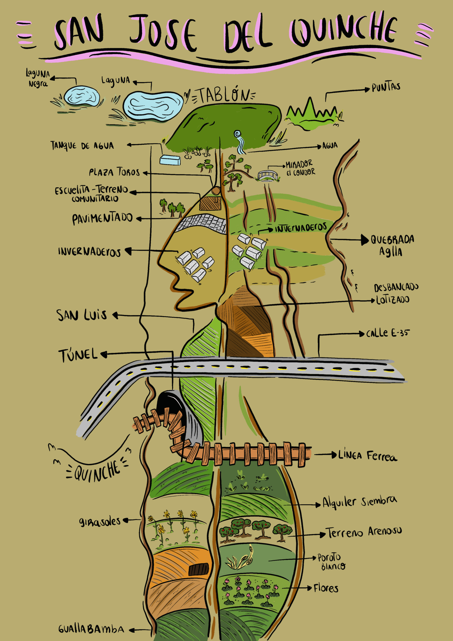 San José del Quinche no es solo un punto en el mapa: es un territorio tejido por el agua, la tierra y la memoria compartida. Desde las lagunas del Tablón y el bosque que lo rodea, hasta los cultivos y flores que bajan por la quebrada hacia Guayllabamba, se despliega una historia de trabajo colectivo y vínculos profundos con la naturaleza. Aquí nacen caminos que antes llevaban a las haciendas y ahora conectan chacras, escuelas y plazas donde se cruzan generaciones. Cada rincón –como El Puntas, el Condor Mirador o el antiguo túnel del tren– guarda un relato, una señal del pasado que sigue latiendo.